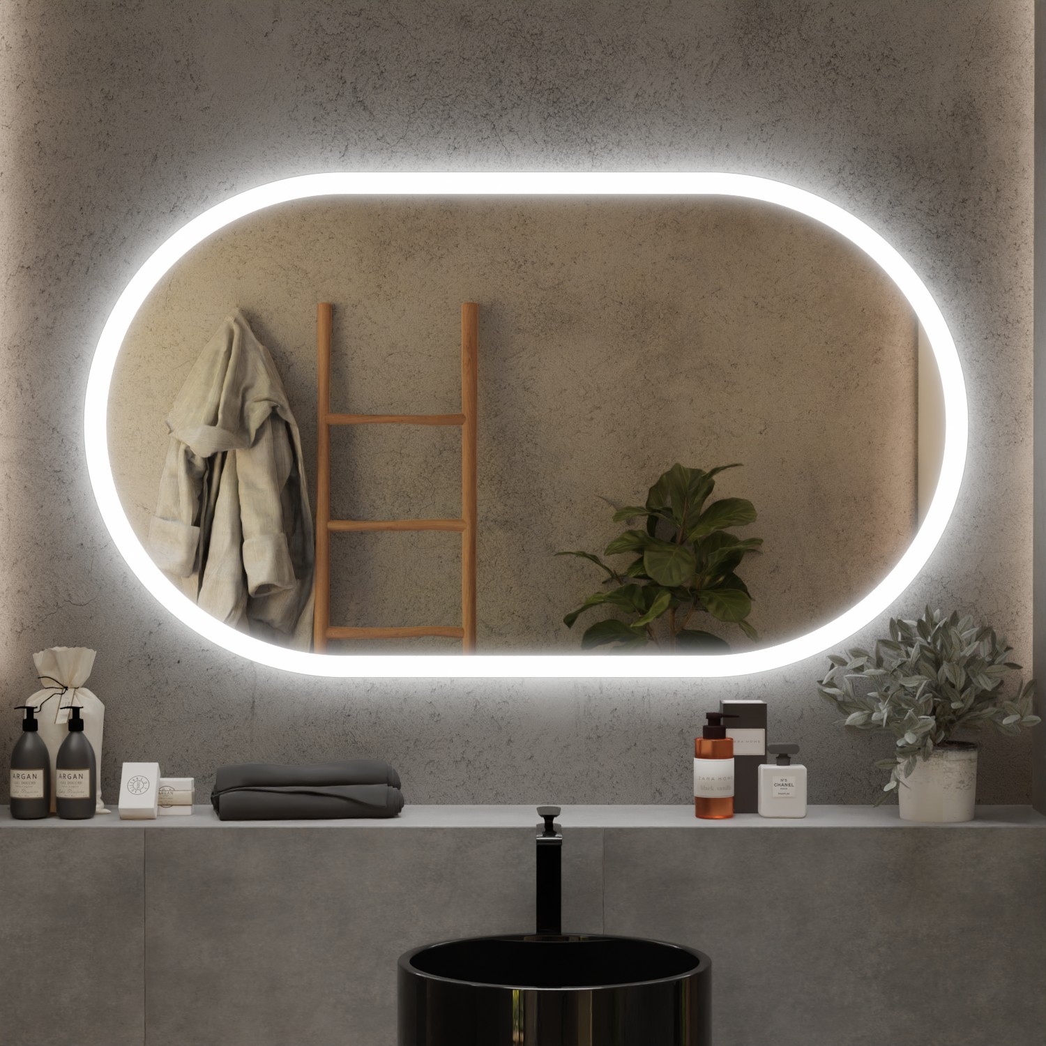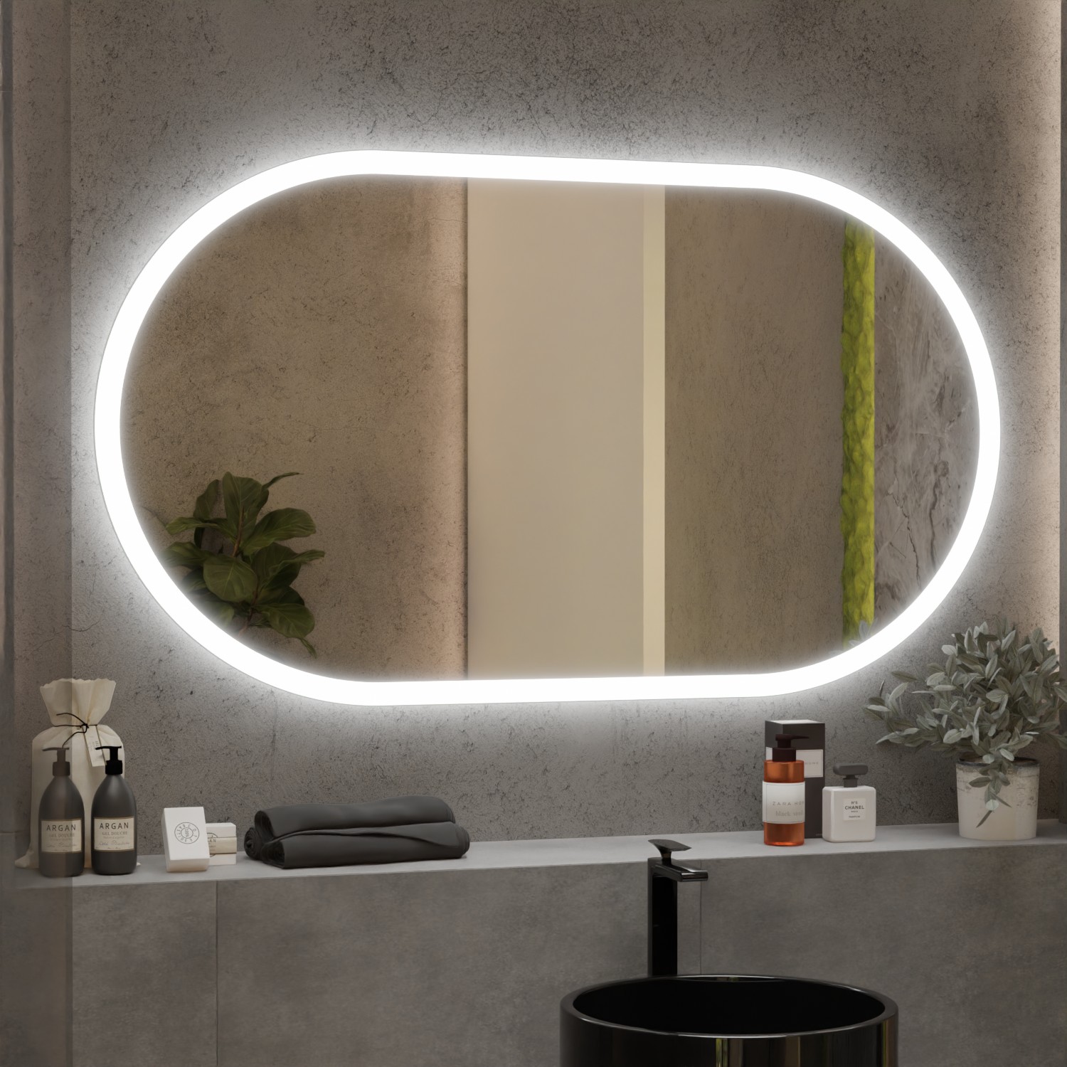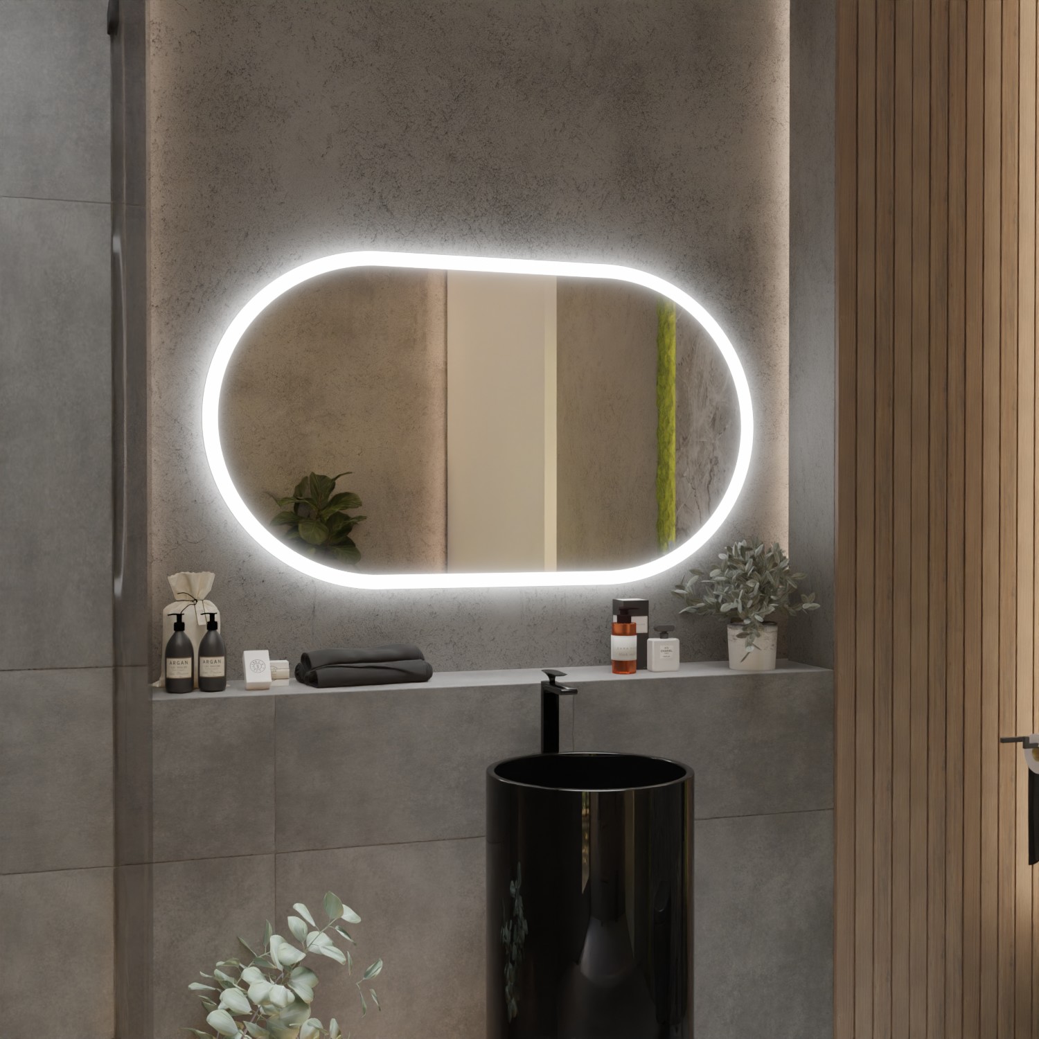 - Warm- und Kaltweiß inkl. Doppel-Touch-Sensor: Es befinden sich auf der Spiegeloberfläche zwei Touch-Sensoren. Der eine Sensor ist für das warmweiße und der andere für das kaltweiße Licht. Wenn beide Sensoren eingeschaltet sind entsteht eine Art Tageslichtweiß. Der Stromverbrauch steigt dadurch allerdings. Bei dieser Option ist die Beleuchtung nicht dimmbar. Für den Fall, dass die Stromzufuhr unterbrochen wird, gibt es keine Memory-Funktion.