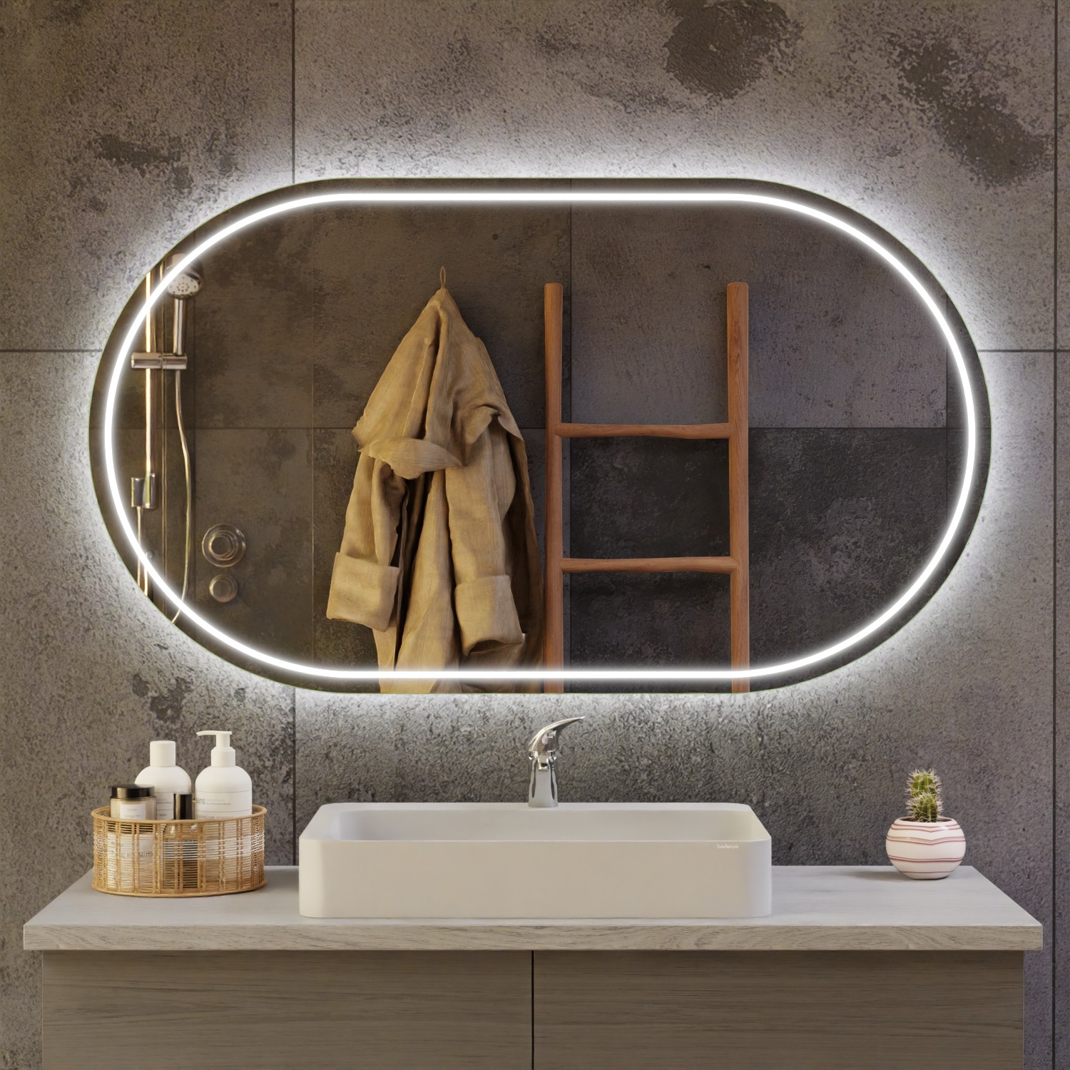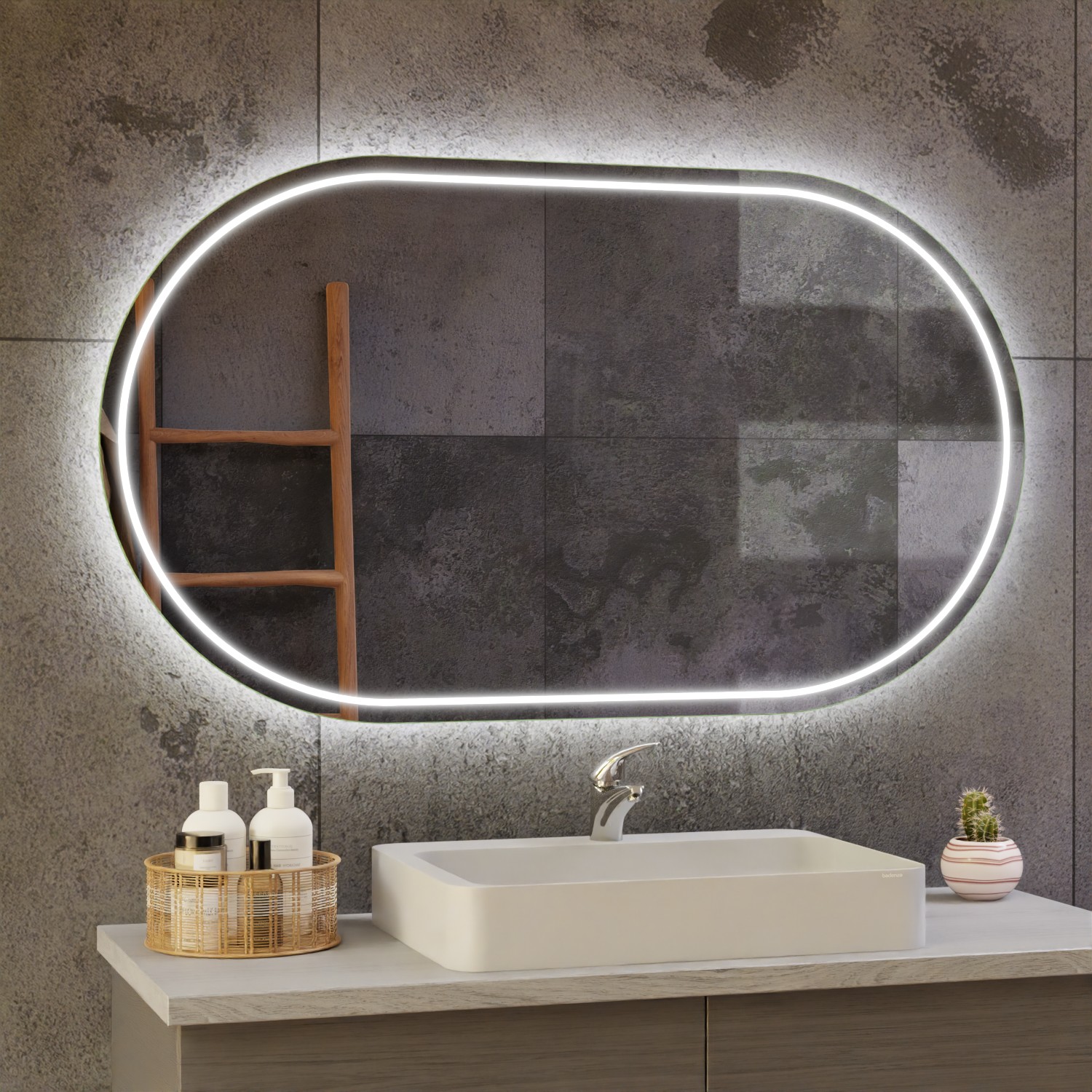 „LED-Band doppelt“ heißt, dass der Spiegel mit doppelter Anzahl an LED ausgestattet wird. Die Leuchtdioden-Bänder werden parallel zueinander verlegt und Sie profitieren von mehr Leuchtkraft und auch Helligkeit. Die Lichtauslässe bzw. Satinierung wird nicht beeinflusst.