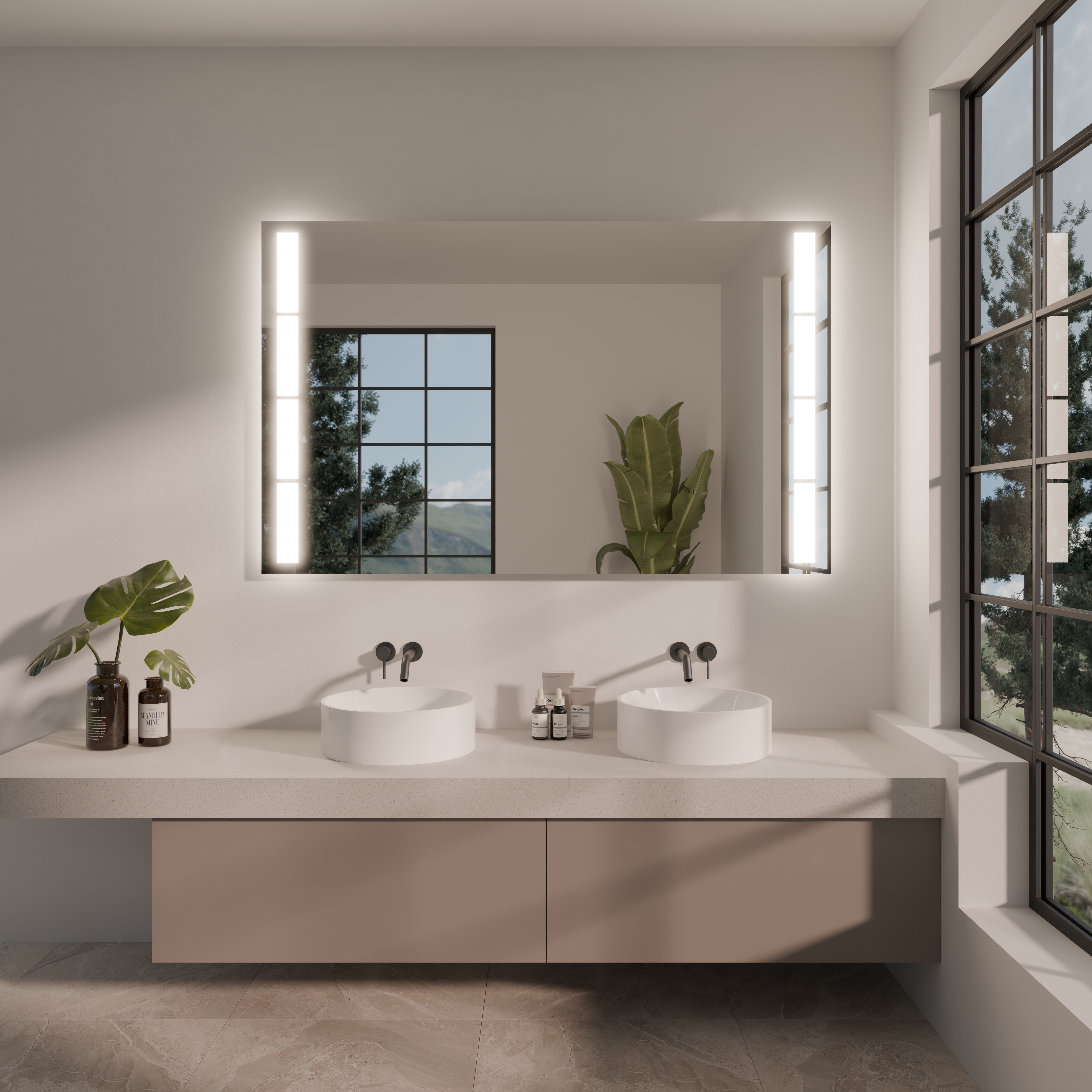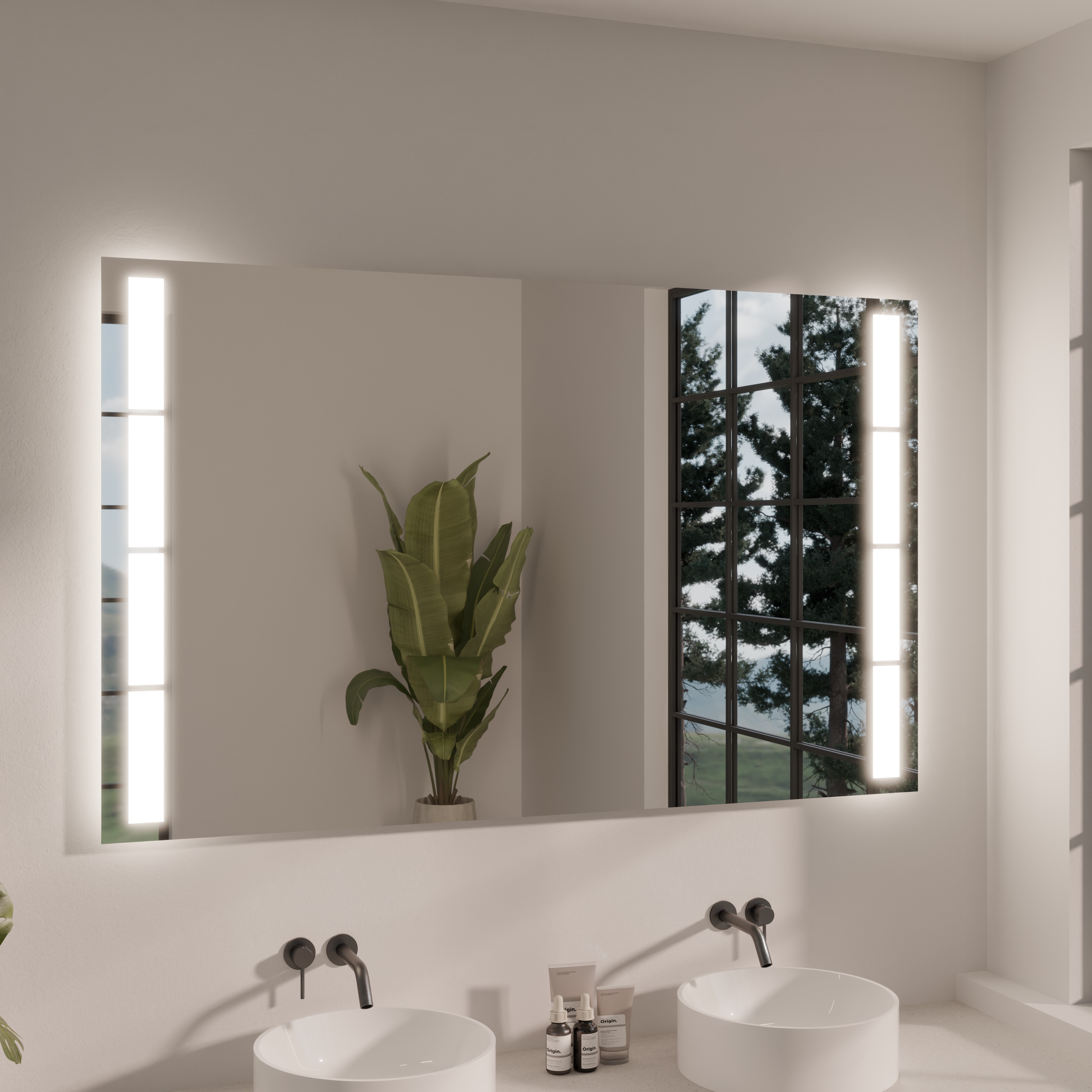 - Warm- und Kaltweiß inkl. Doppel-Touch-Sensor: Es befinden sich auf der Spiegeloberfläche zwei Touch-Sensoren. Der eine Sensor ist für das warmweiße und der andere für das kaltweiße Licht. Wenn beide Sensoren eingeschaltet sind entsteht eine Art Tageslichtweiß. Der Stromverbrauch steigt dadurch allerdings. Bei dieser Option ist die Beleuchtung nicht dimmbar. Für den Fall, dass die Stromzufuhr unterbrochen wird, gibt es keine Memory-Funktion.